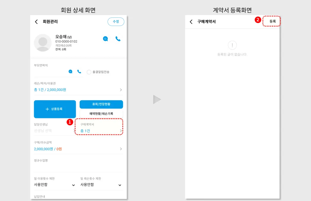 회원등록을 회원상세화면에서, ‘구매계약서’를 선택합니다.