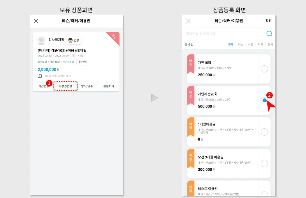 수강권변경탭을 눌러 불러온 상품등록 화면에서 변경할 수강권을 골라 선택합니다.