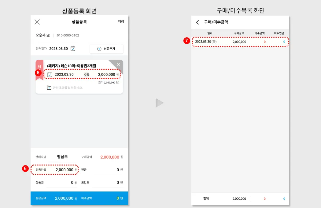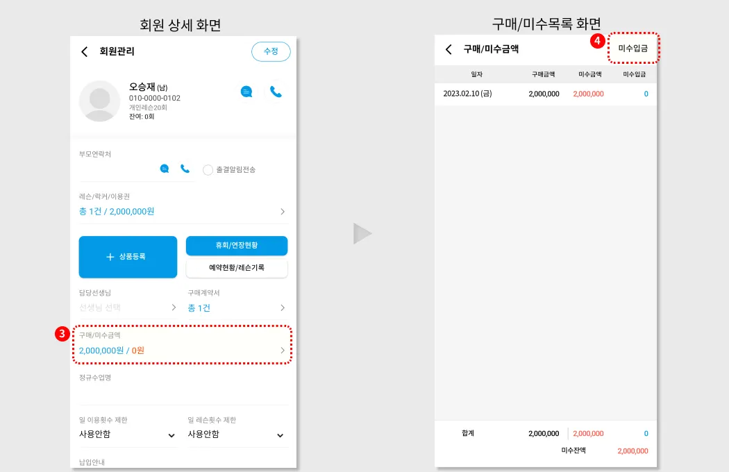 (메뉴 > 회원관리 > 회원상세 > 구매/미수등록)