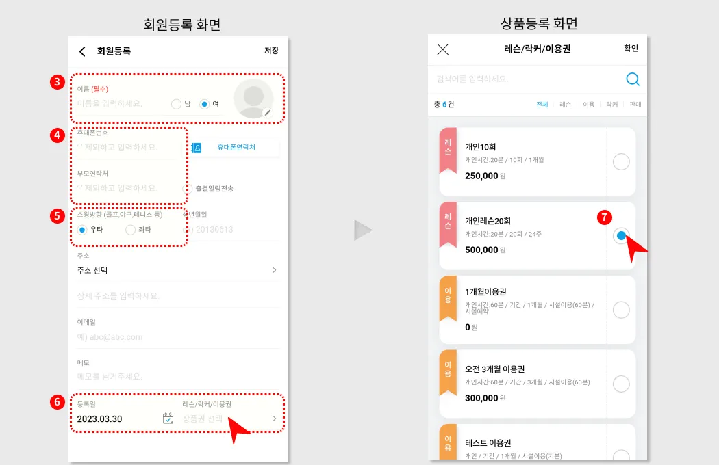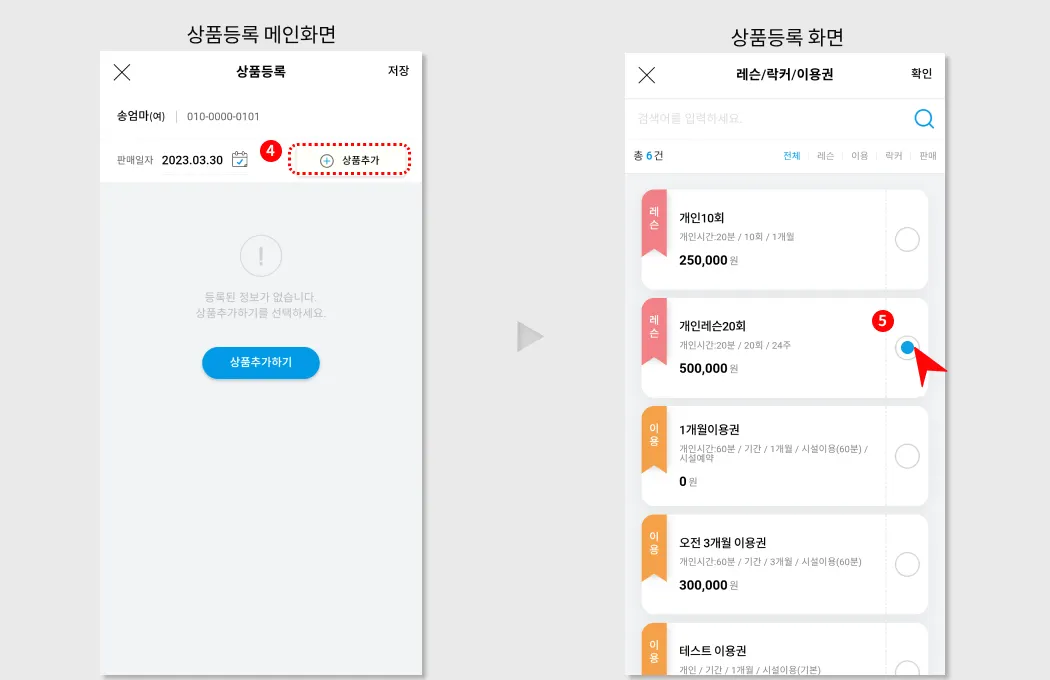 (메뉴 > 회원관리 > 회원상세 > 수강권 추가)