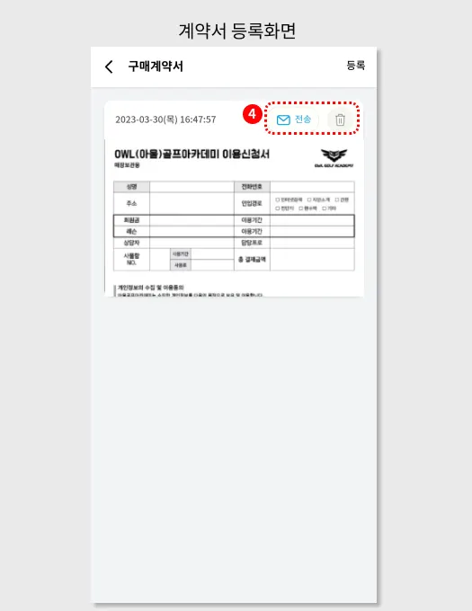 등록이 완료되면, 전송버튼을 눌러, 회원에게 문자메세지로 계약서를 전달할 수 있습니다. (삭제도 가능합니다)