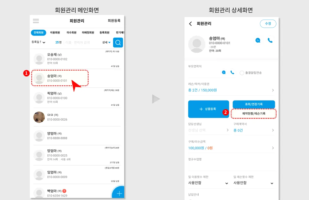 (메뉴 > 회원관리 > 회원상세 > 예약현황/레슨기록 )