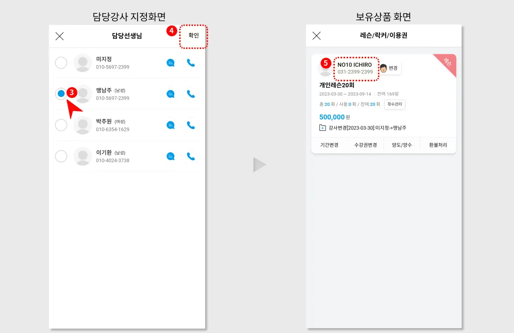 담당강사 지정을 보류한 회원에게 강사를 지정해, 레슨예약을 할 수 있도록 설정합니다.