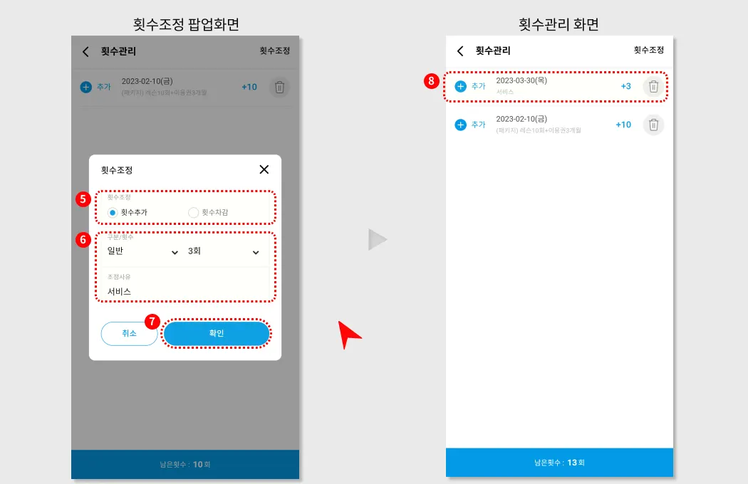 횟수조정 팝업에서, 횟수를 추가할지 차감할지 정합니다.