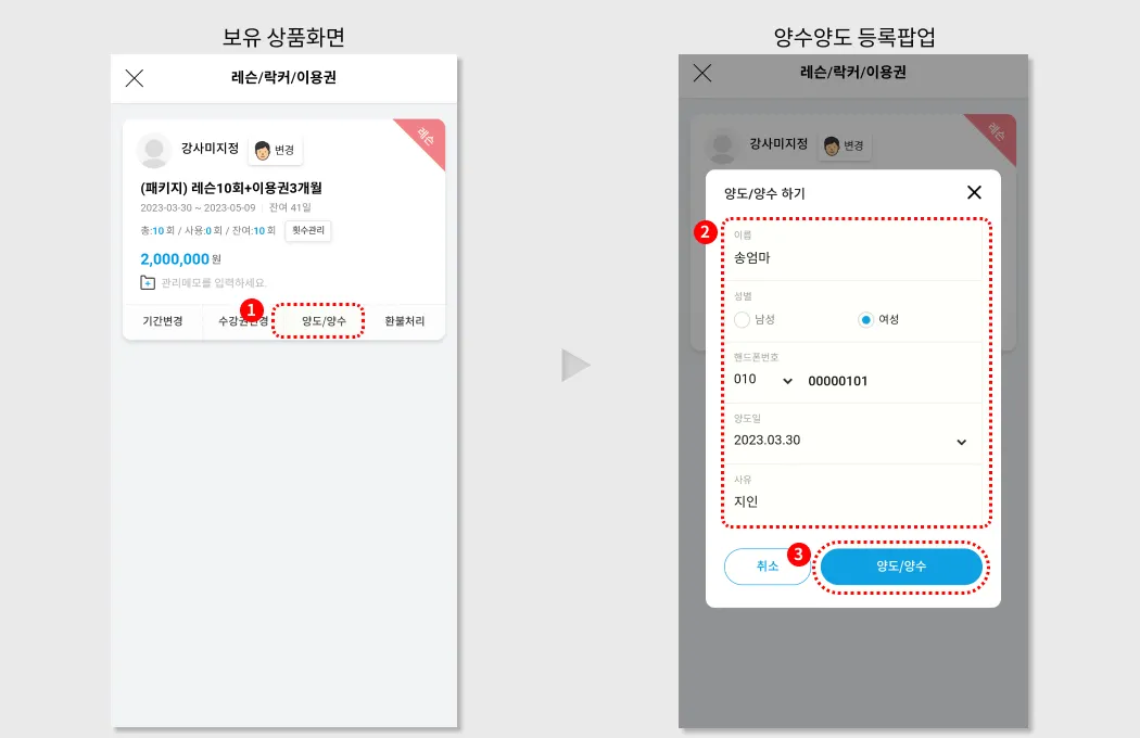 양도양수팝업에 양수인의 정보를 등록(전화번호 필수)하고 양도일과, 사유을 입력합니다.