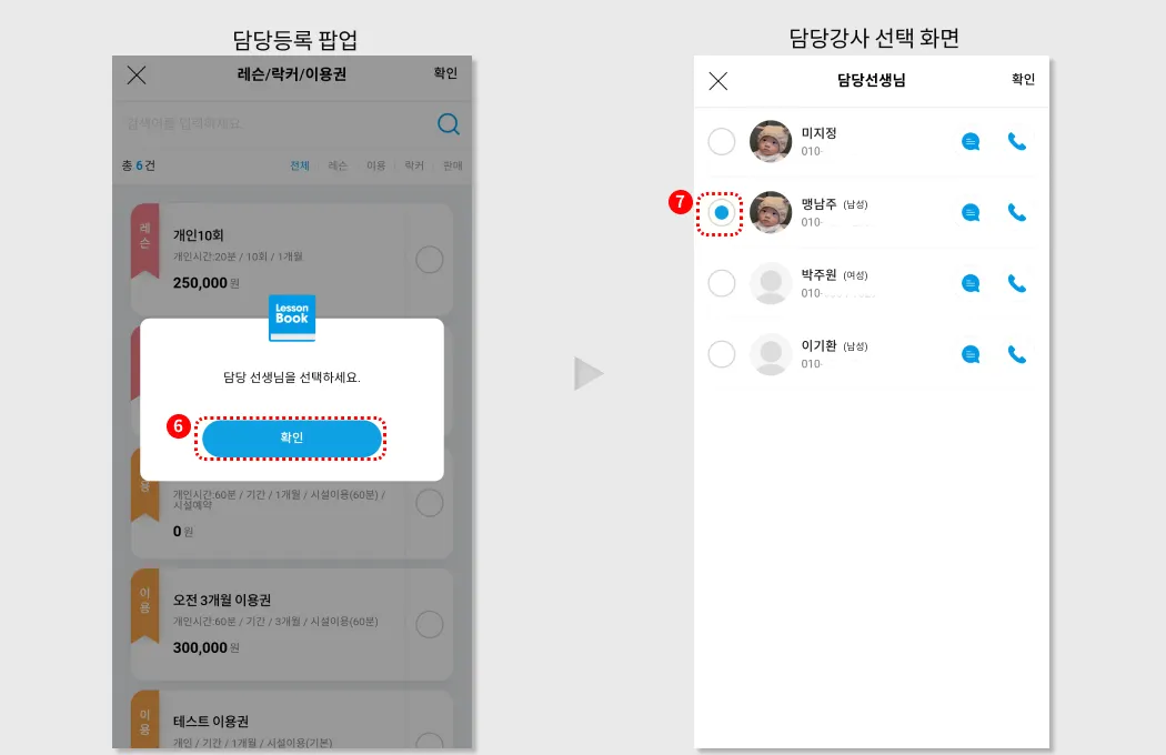 레슨권을 선택하면, 담당강사를 선택하라는 팝업이 뜹니다.