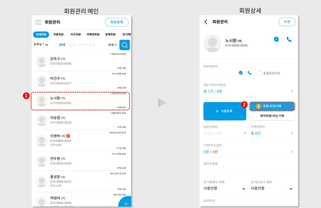 회원관리 메인화면에서, ‘휴회/연장’ 등록할 회원을 선택해 회원상세페이지를 호출합니다.