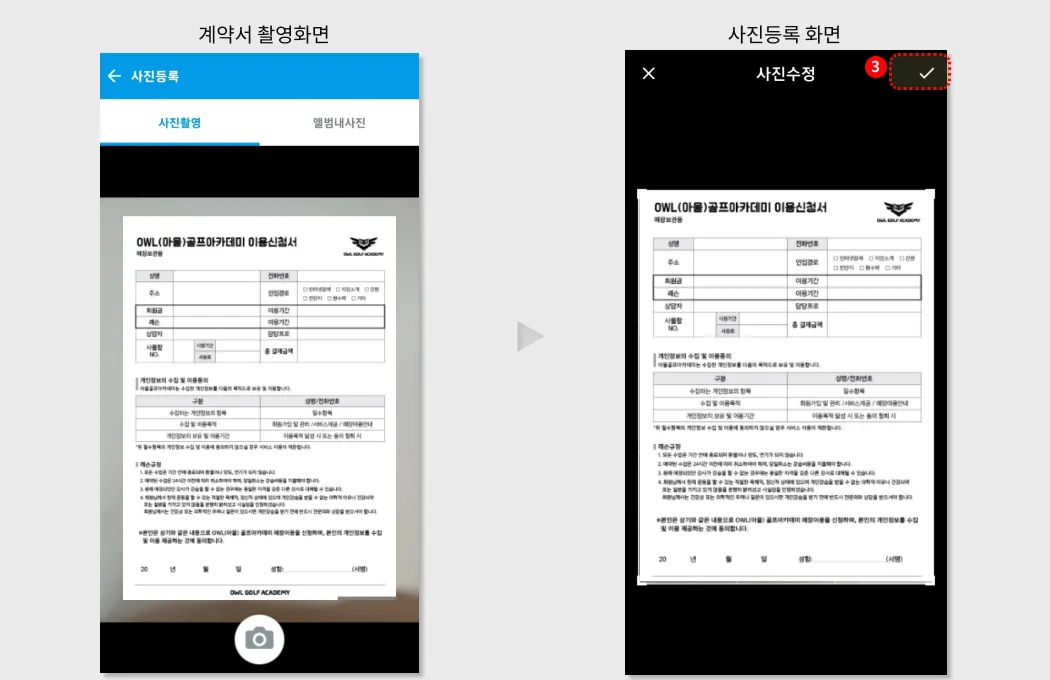 계약서 등록화면에서, 등록버튼을 눌러, 카메라를 실행합니다.