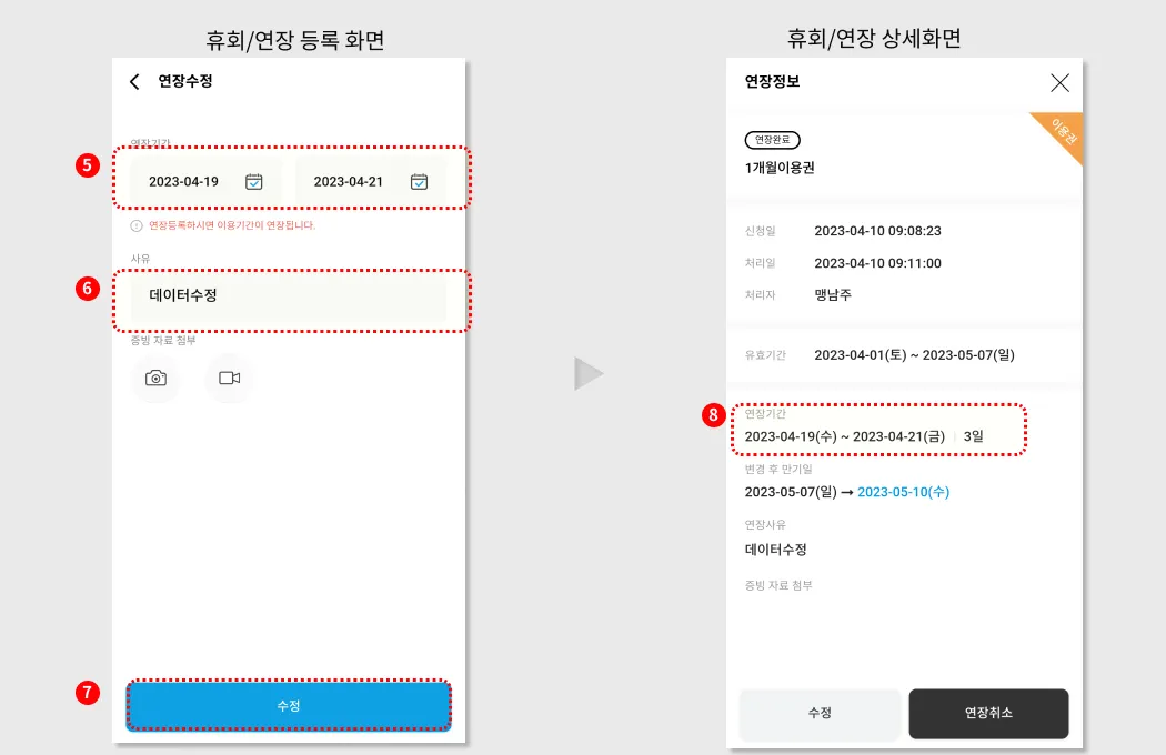 수정버튼을 눌러, 휴회/연장 등록하면을 호출합니다.